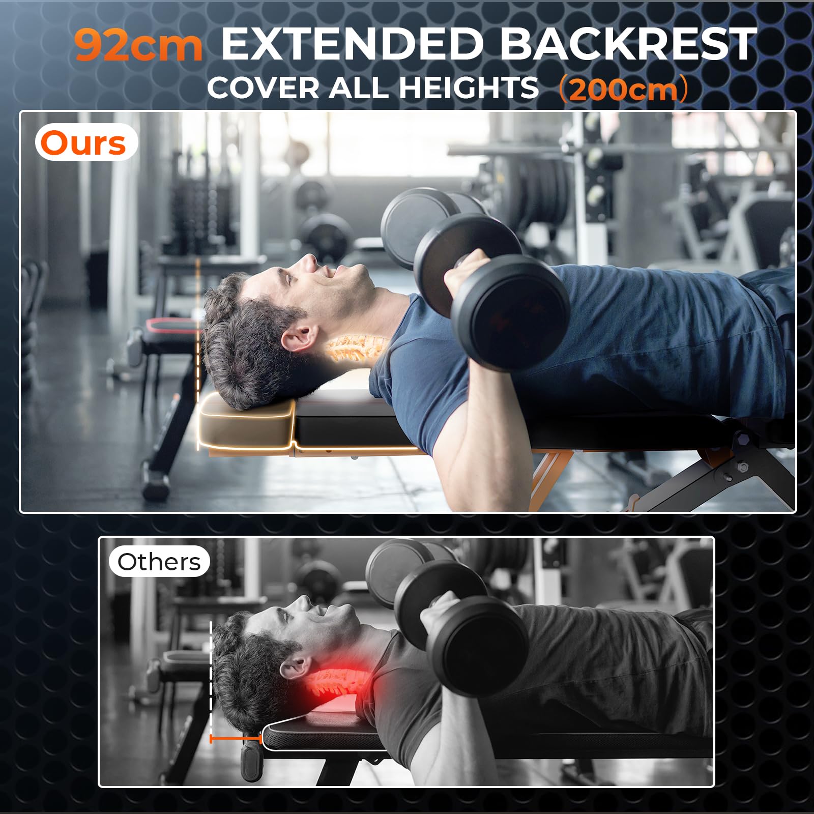 • 【Alle Höhen abdecken(190cm)】Mit dem Zusatz eines Kopfstützendesigns kann die Rückenlehnenlänge der schrägbank 91 cm erreichen und Benutzer mit unterschiedlichen Körpergrößen (190 cm) aufnehmen und gleichzeitig Ihren Nacken und Ihre Wirbelsäule effektiv schützen. Die 31,5 cm breite Rückenlehne bietet starken Halt für den Rücken und die Taille von Personen mit unterschiedlichen Körpertypen, wodurch Ihre bankdrücken bank bequemer und effizienter werden.
